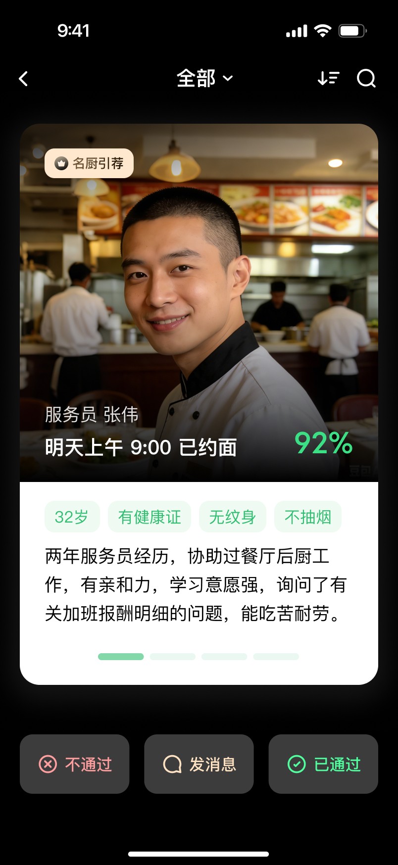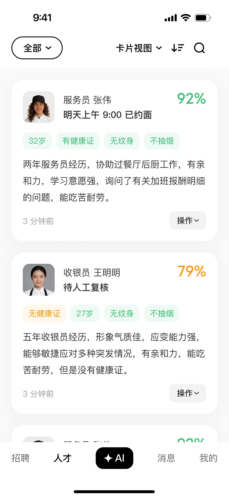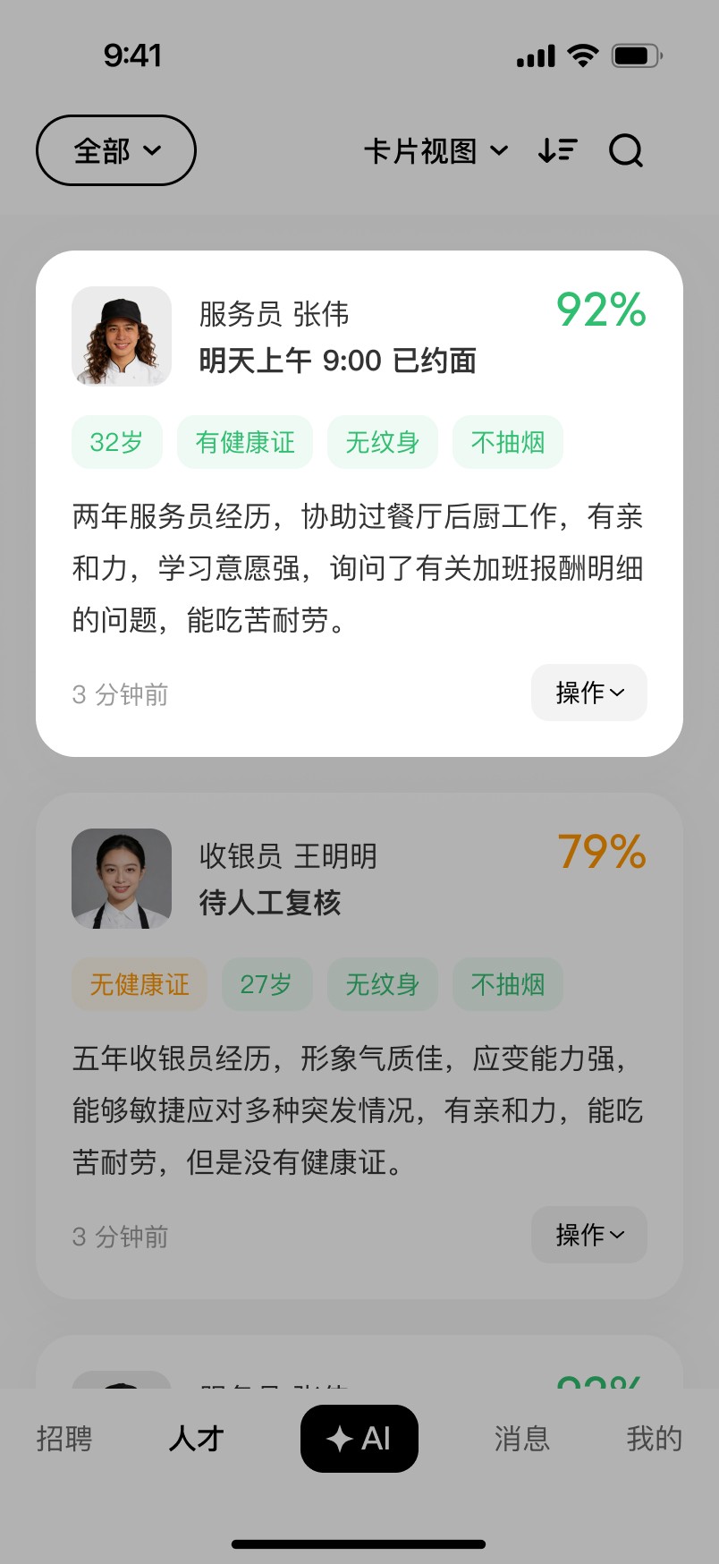 Horizontal Swipe: Switch between different data dimensions for a single candidate to avoid information overload on one screen.