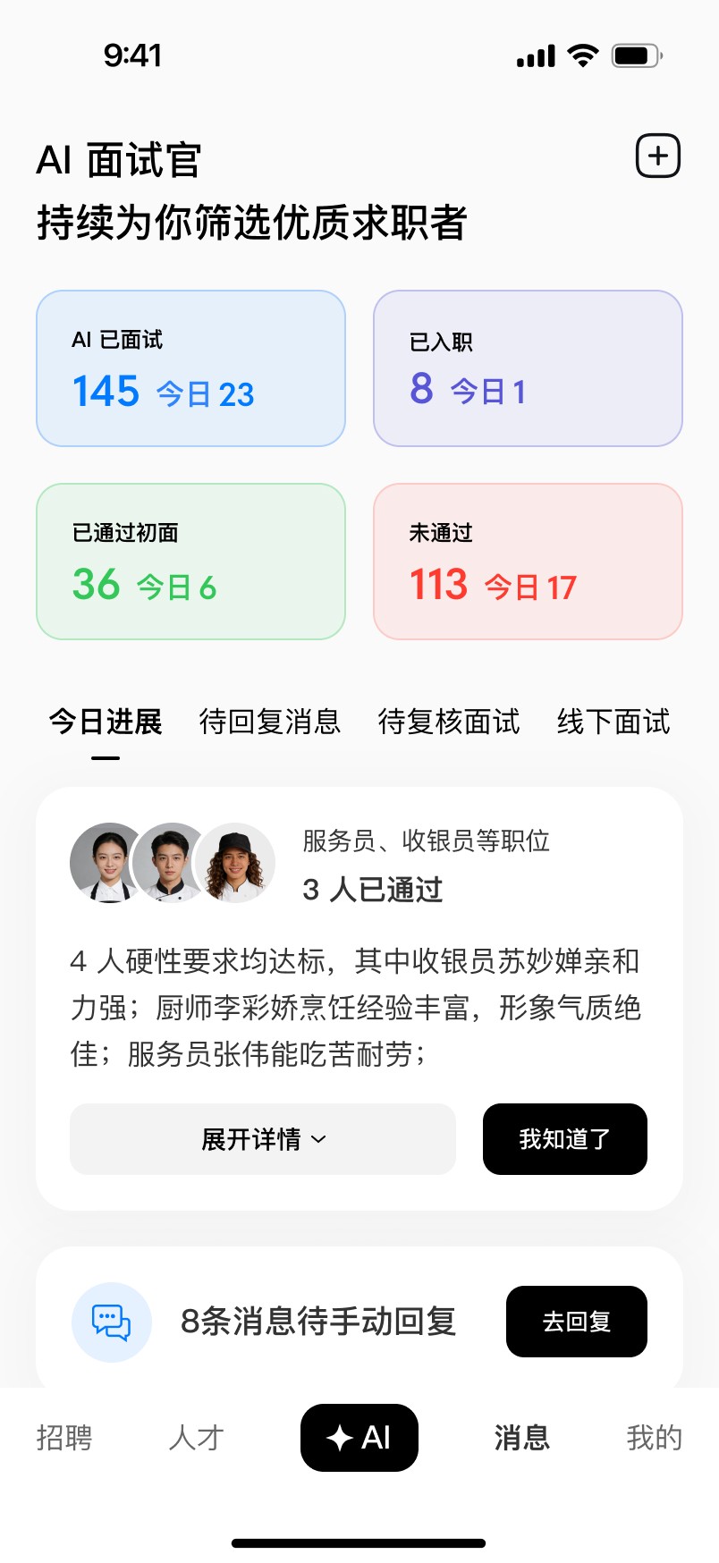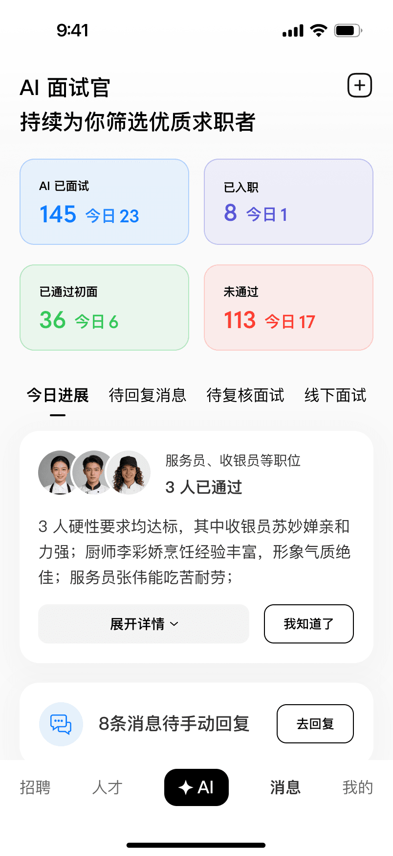 AI handles the first round of phone screening and repetitive replies.