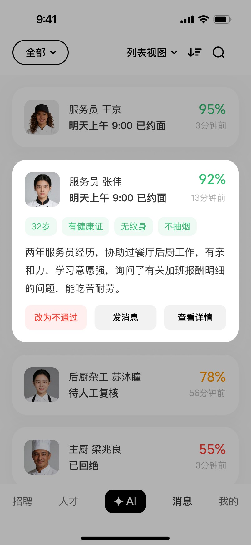 AI manages initial communication to mine candidate traits and prevent churn caused by slow replies.